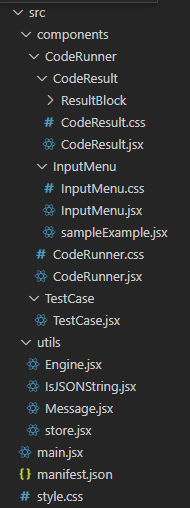 다른 크롬 익스텐션에서는 필요한 manifest.json, styles.css, main.js가 root 폴더에 있는 것이 아니라 src를 기준으로 웹팩 번들링을 하였다. 그리고 필요한 파일을 컴포넌트 별로 분리하여 관리하였다.