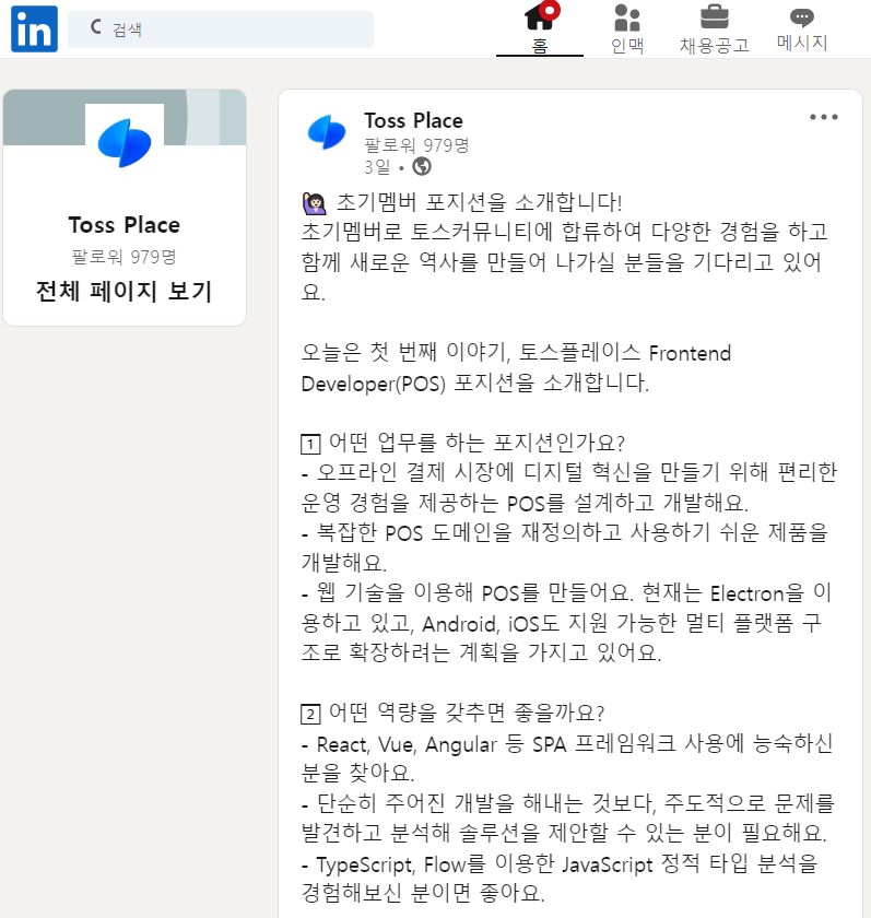 토스플레이스에 떨어지고 토스플레이스는 누가갈까? 하고 알아보다가, 링크드인에서 토스 플레이스에 대한 소식들을 볼 수 있었다. 이 글을 보니 지원할까? 생각이 들기보다, 지금 프로젝트 만들던 것을 마무리하구, 다시 한번 도전하기로 결심했다. 12월에 +ㅆ+ 도전!