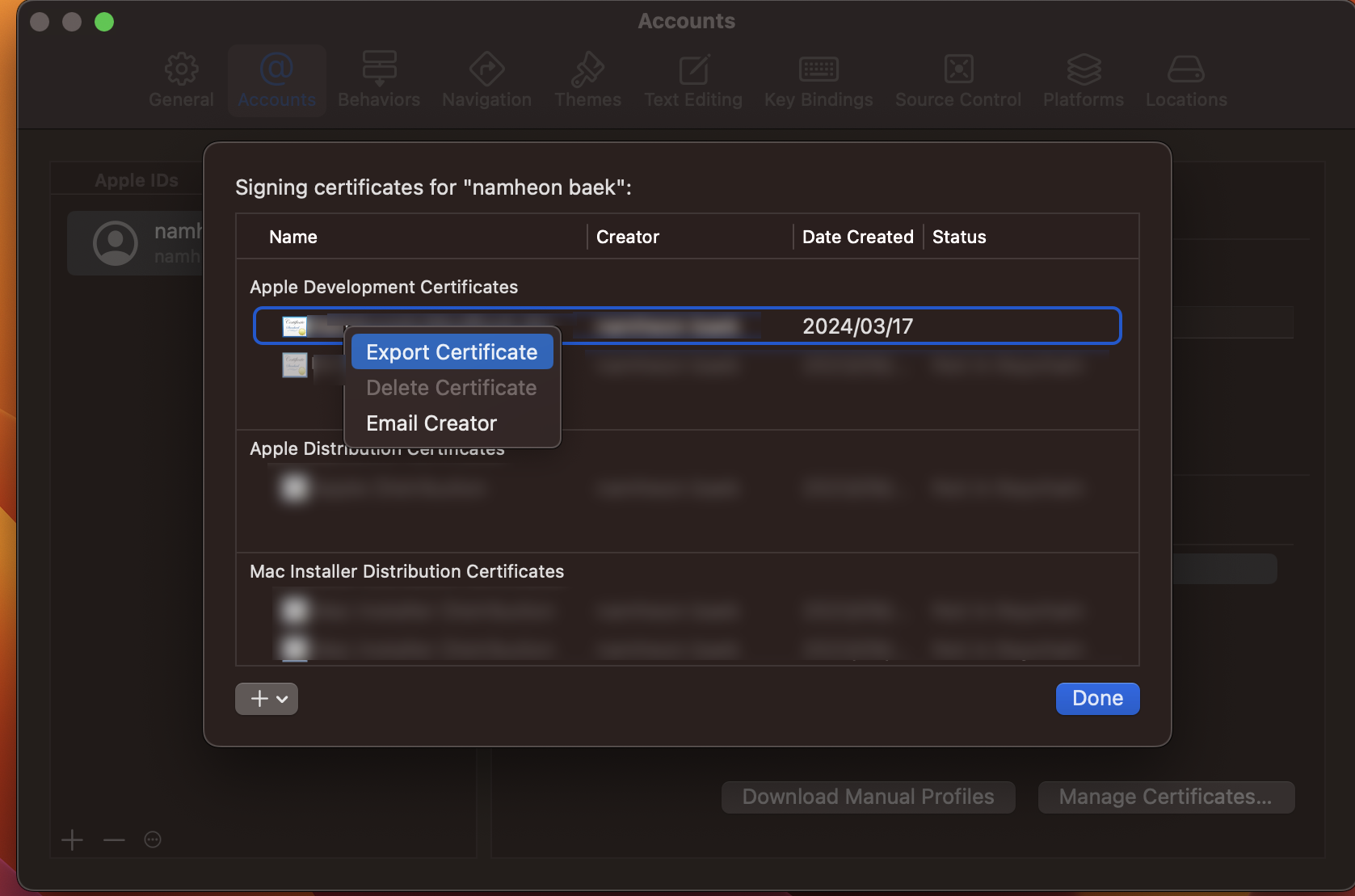 코드 사이닝을 하려면 우선, certification을 만들어야한다. 정말 많은 글에서 apple developer에서 받아야한다고 해서 그 방법을 시도하면서 얼마나 시간을 날렸는지 모르겠다. apple developer로 만들어서 진행하다보면, 아마 verify가 안된 인증서라고 나올 것이다.