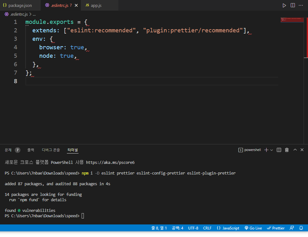 위에 내용은 -D같은경우, eslint, prettier 등등 4개의 각 node package module을 설치를 하고 package.json에 데브 디펜던시리스트를 넣어주겠다는 단어이다. 그리고 그 뒤에 4개의 모듈들은 우리가쓸 eslint와, prettier와, 서로 충돌하지 않게하는 모듈(config prettier)와, eslint를 실행할 때, prettier을 실행하는 모듈(eslint-plugin)이다.