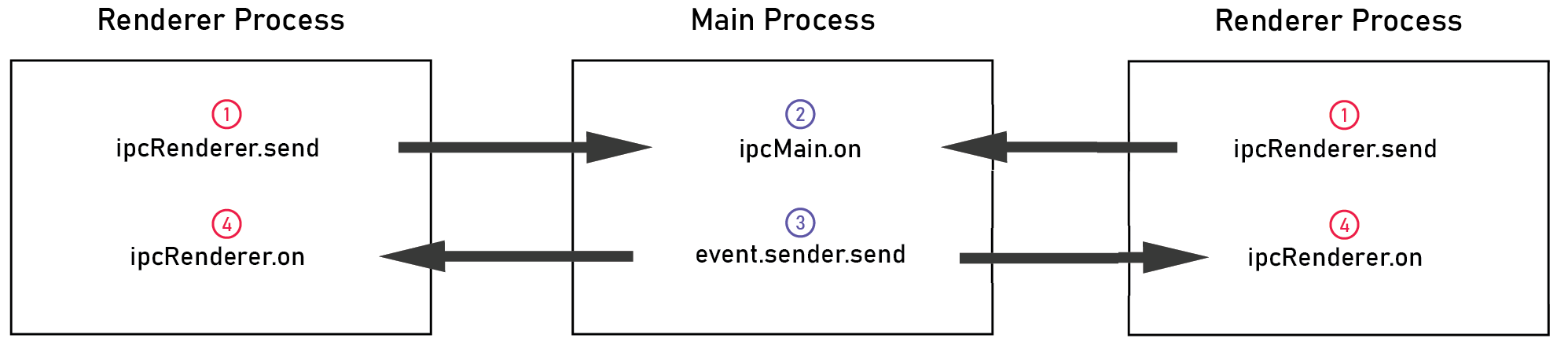 - 렌더러 전체에 영향을 주는 이벤트 : ipcMain.send⇒ipcRenderer.on
