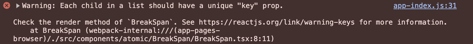 이 에러를 없애지 않는다고 해서 문제가 생기지 않는 경우도 있지만, 이런 메세지들 때문에 중요한 에러 메세지를 놓칠 수 있기 때문에 이 에러 메세지를 없애는 방법에 대해서 이야기하려고 한다. 보통 이 메세지는 배열을 맵으로 컴포넌트를 반복해서 넣는 경우에 생긴다. 이 때는 배열의 고유한 값을 이용하여 (고유한 값이 없다면 index라도 이용하여) key 값을 넣어주면 된다. 일반적인 htmlElement로 작성하는 경우에는 eslint에서 미리 알려주기 때문에 key 값이 안들어간 경우를 미리 알 수 있지만..