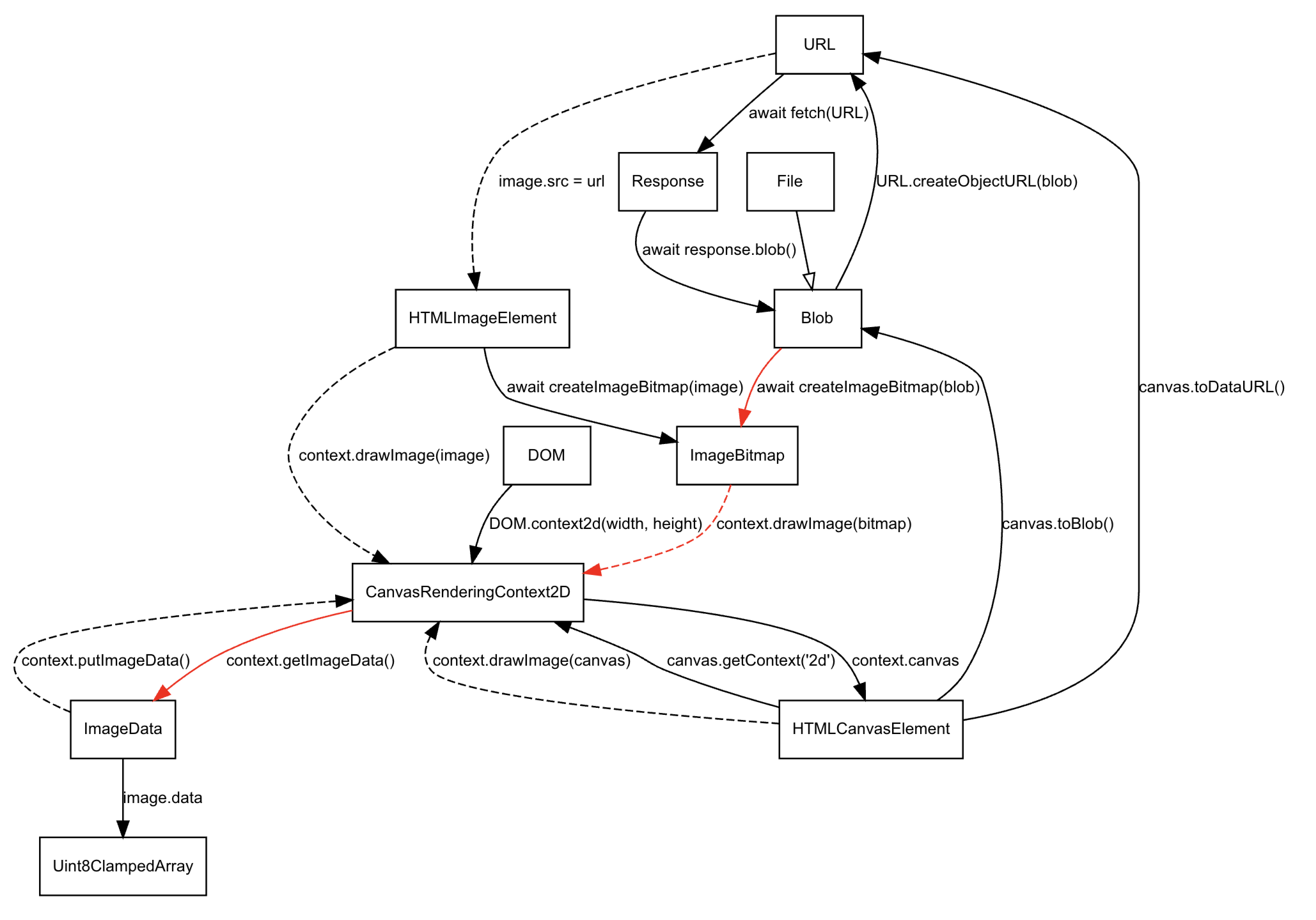 드디어 이미지의 그래프에 있는대로 URL.createObjectURL를 이용하여 데이터 url만들 수 있다. (위의 그래프가 정말 다양한 데이터 타입에 대해 이해를 할 수 있지만, 아마 저 그래프는 한 개의 메서드로 바로 변환할 수 있는 경우만 적어놓은 것 같다)