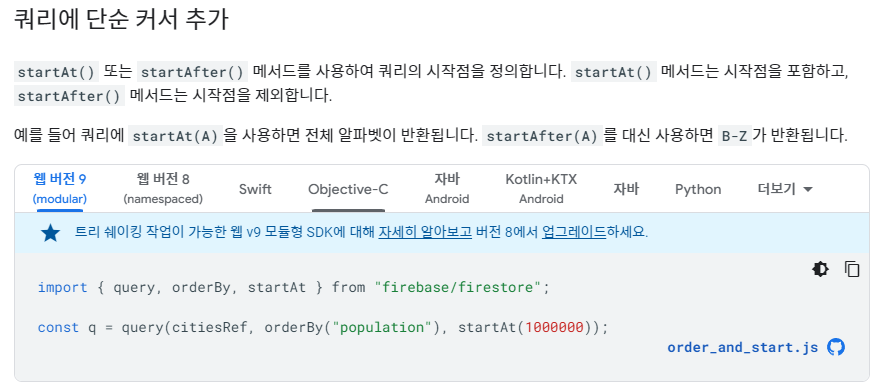 파이어 베이스 사이트에서, startAt을 사용할때 문자를 사용했다는 것을 보고, index를 이용하기보다.. 검색 기준이 되는 것을 기준으로 한다는 것을 알게 되었다. 앞으로 헷갈리는게 있으면 공식 사이트를.. 더 읽어보고.. 하는 습관을 가져야겠다.